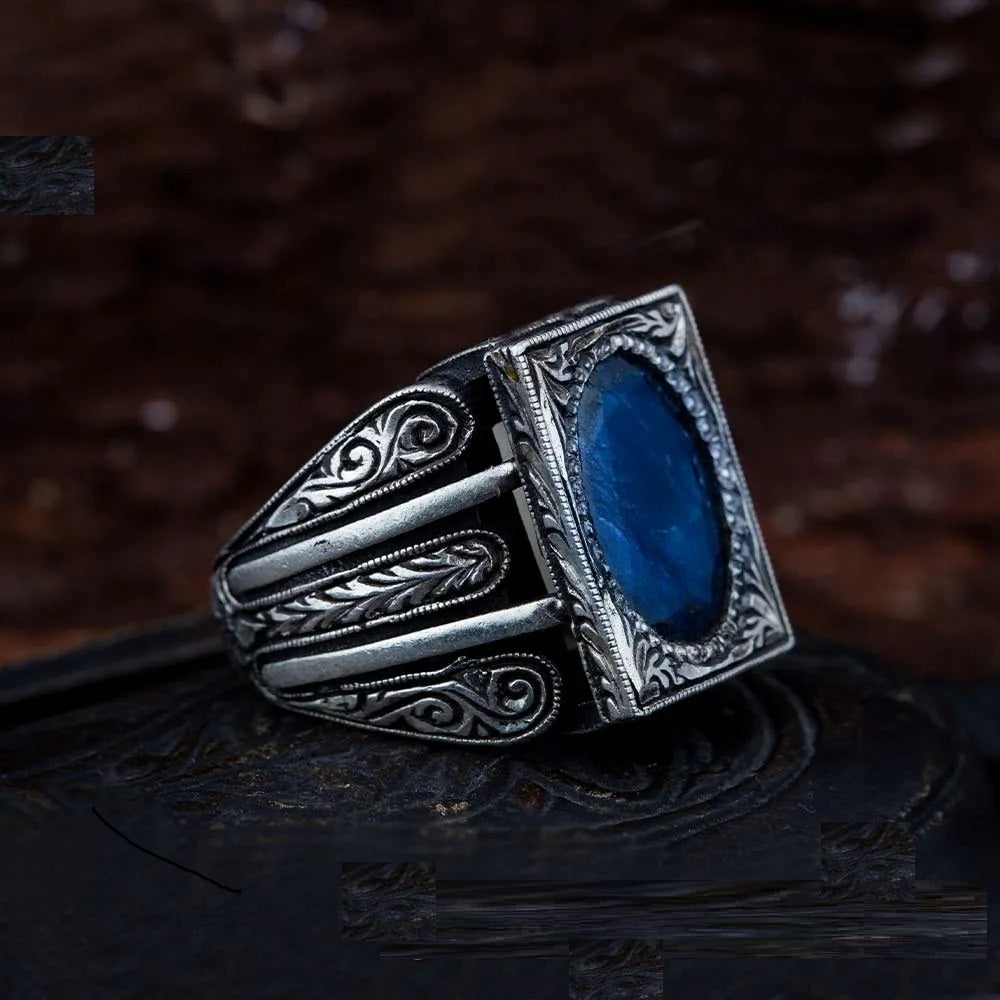 Blue Sapphire Rectangle Hand Engraved Men Ring