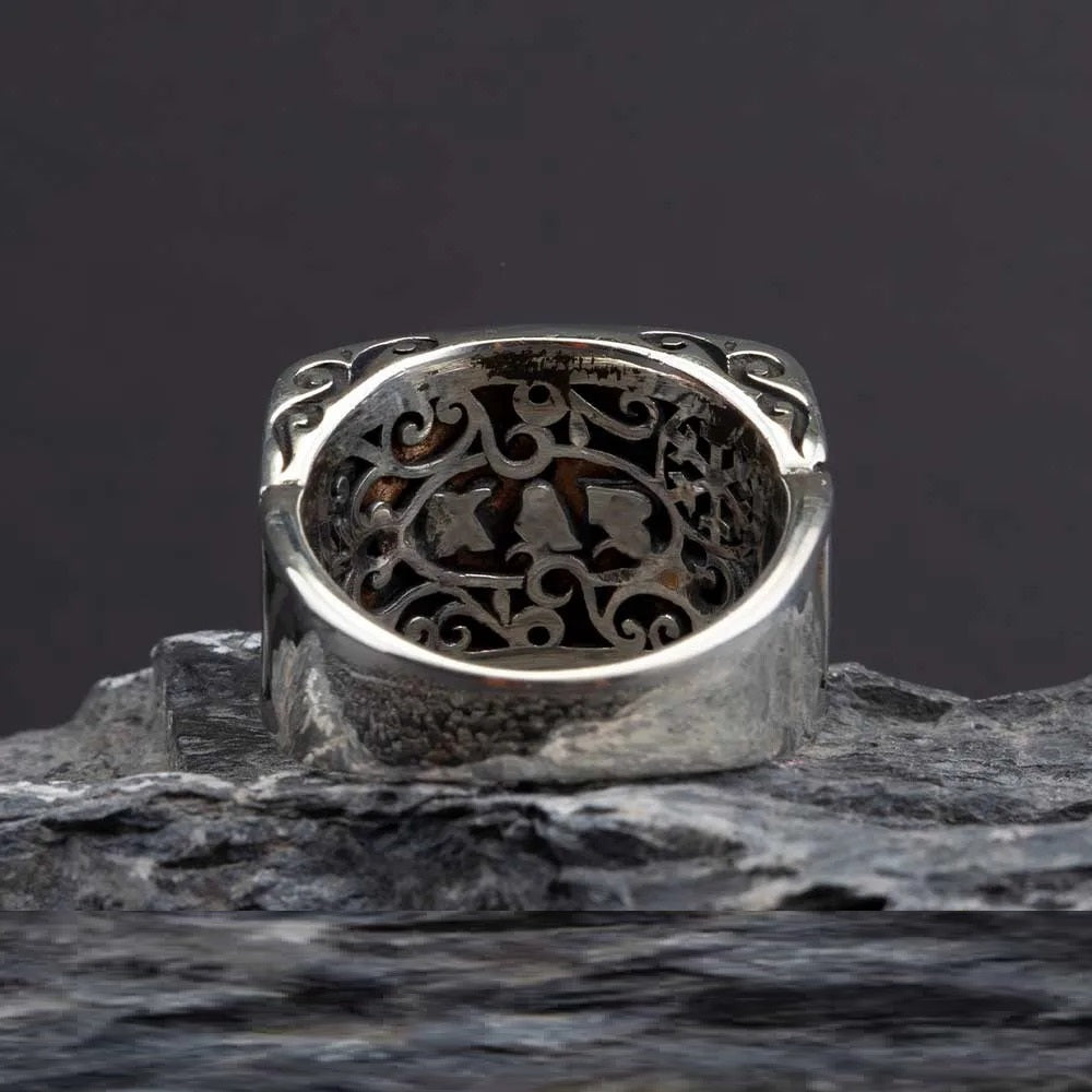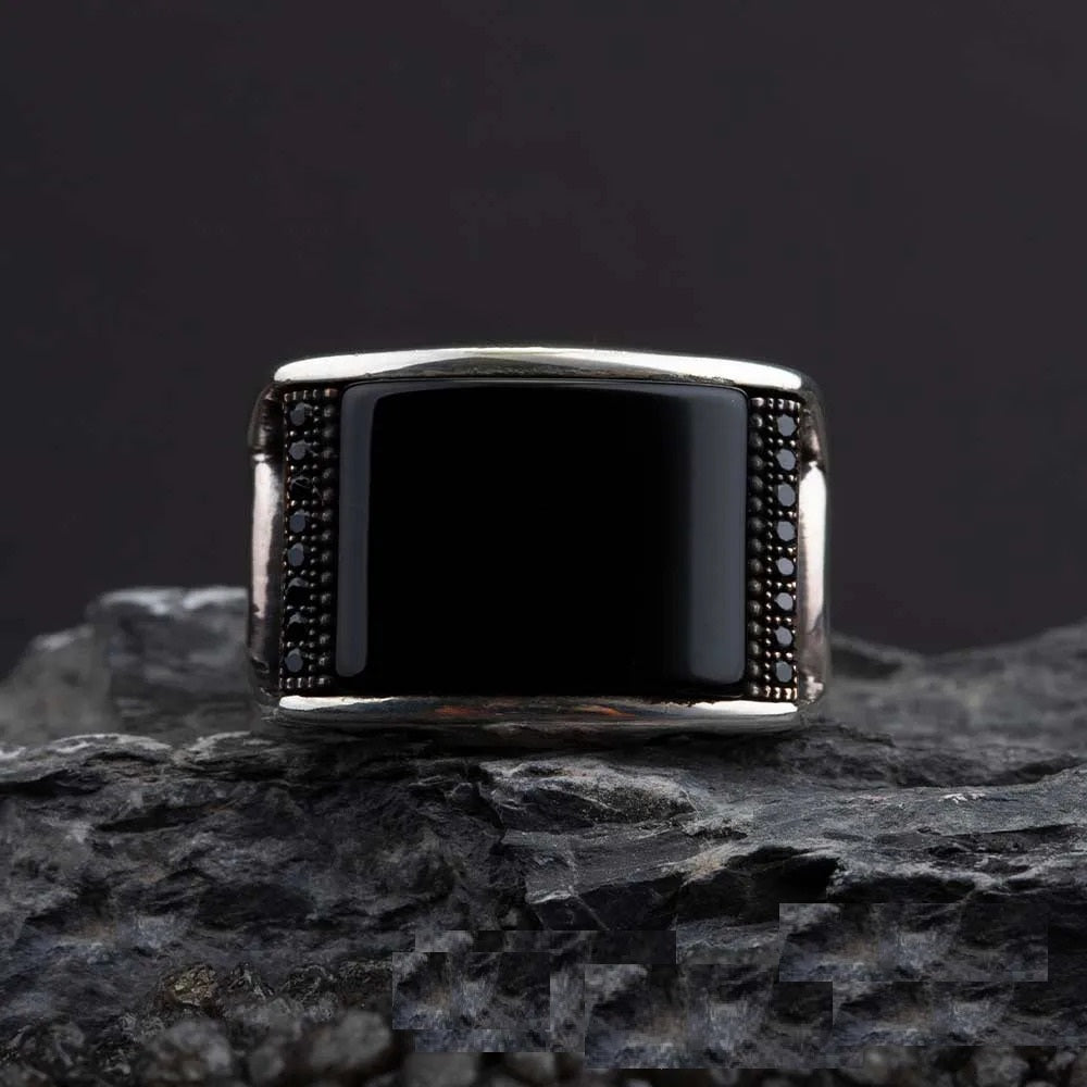 Exclusive Rectangle Red Aqeeq Men Ring made of 925 sterling silver. Aqeeq stone settled on the micro black zircon covered ring.