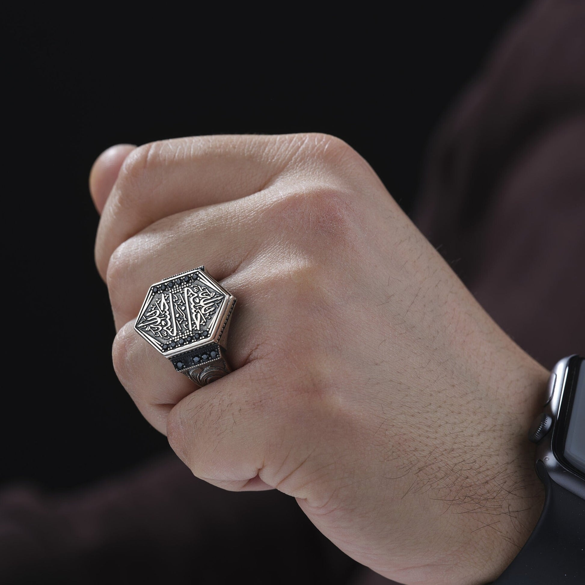 This beautiful ring features a silver plate with the Arabic word hasbunallah engraved on it. Hasbunallah means "Allah is sufficient for us" and is a powerful expression of faith and trust in Islam. The ring is made of 925 sterling silver and has a smooth finish. It is handmade by me in my workshop, using high-quality materials and craftsmanship. This ring is a perfect gift for men who love Islamic art, culture, and spirituality. It comes in a lovely gift box, ready to be given to your loved one.