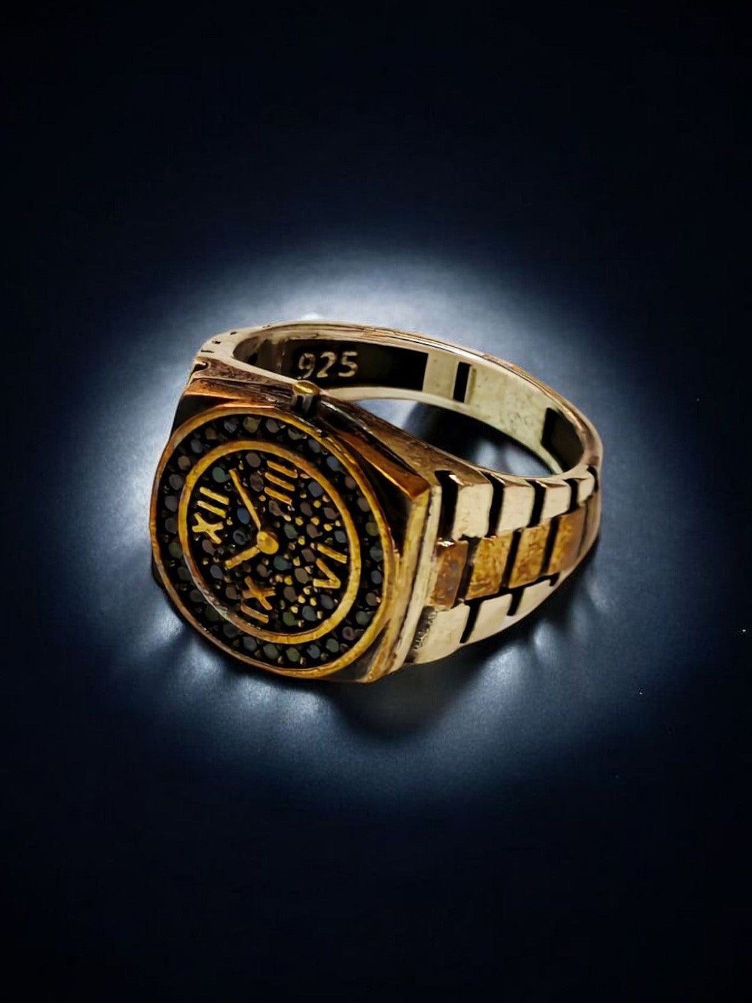 925 Sterling silver Gold -plated blue cubic zirconia studded analog dial embedded finger watch ring has adjustable design details, secured with slip on closure