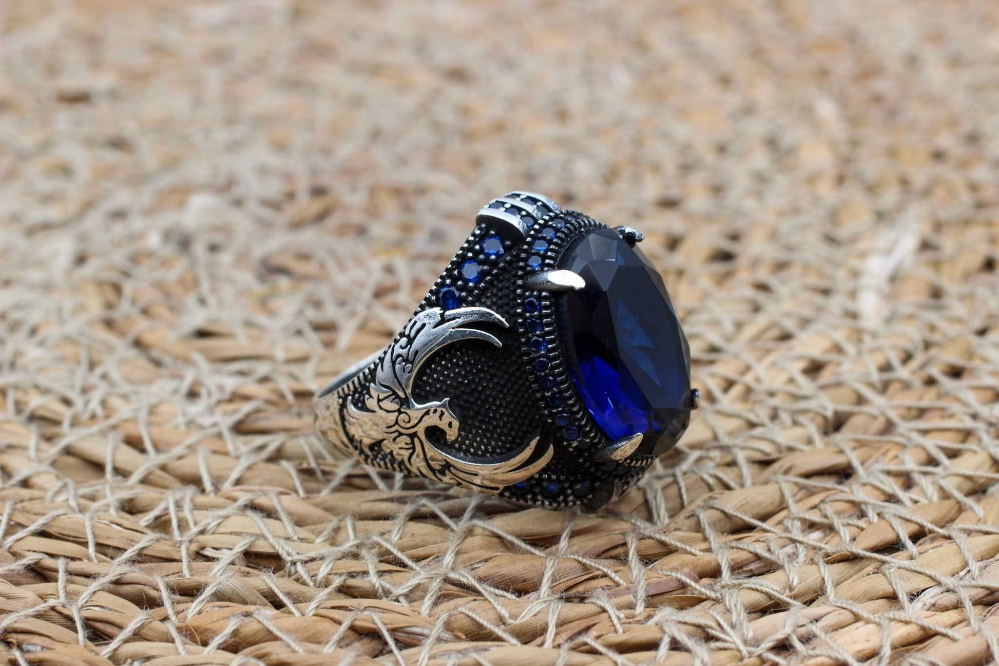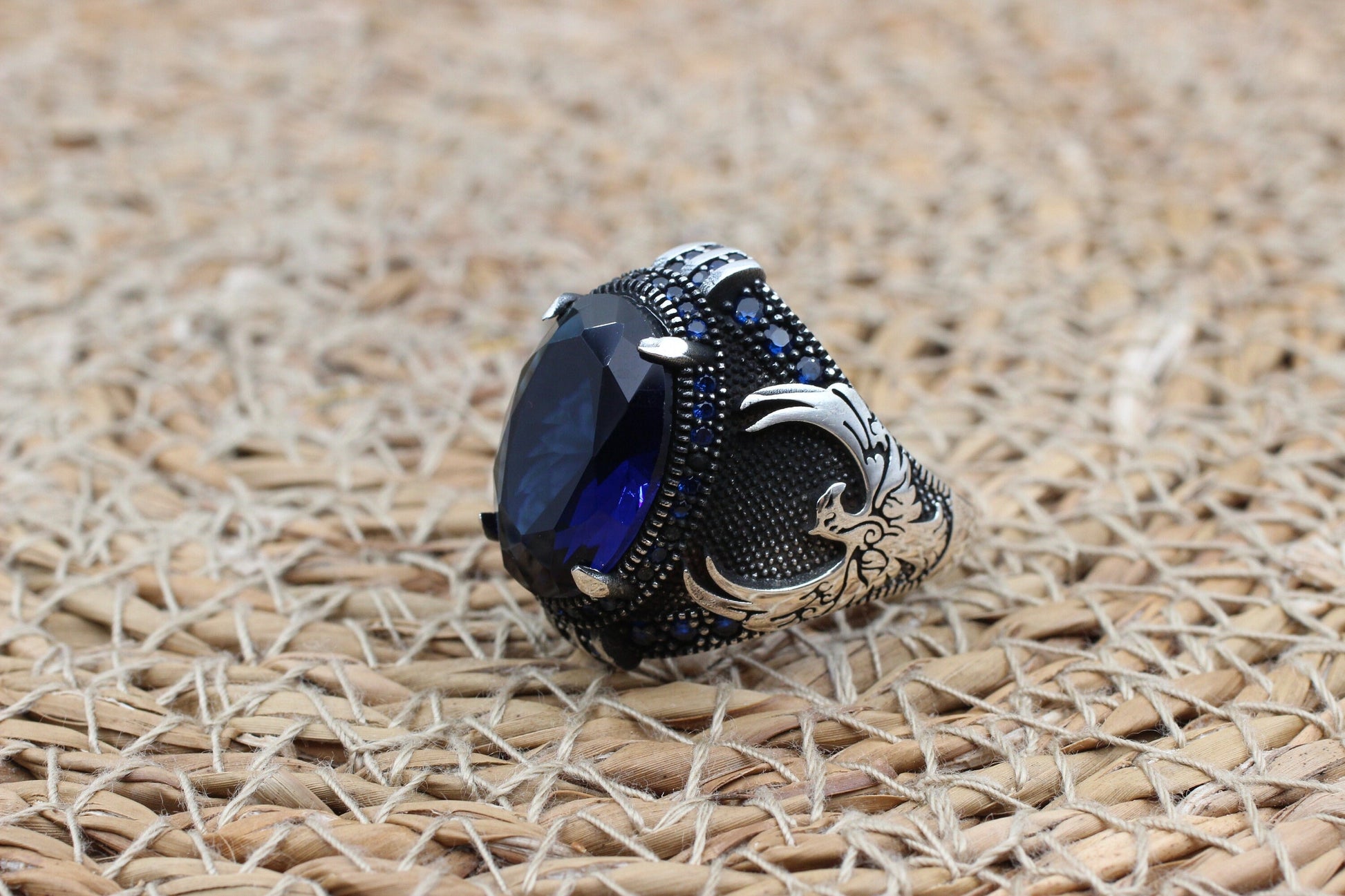 Men's Handmade Ring, Phoenix Men's Ring, Turkish Handmade Silver Men Ring, Ottoman Ring, Sapphire Ring, Gift for Him, 925k Sterling Silver Ring