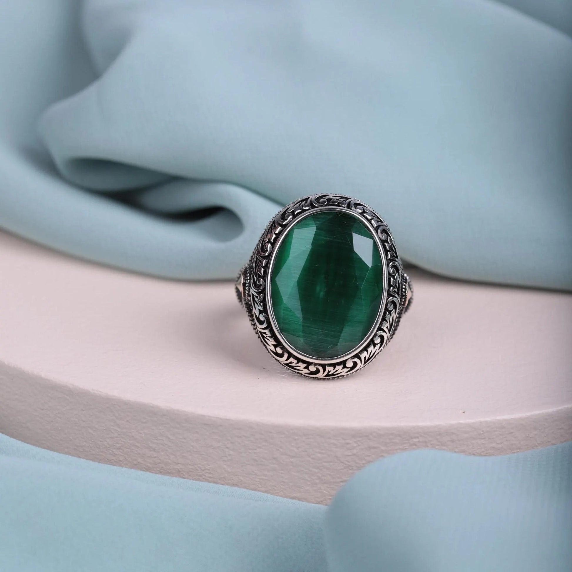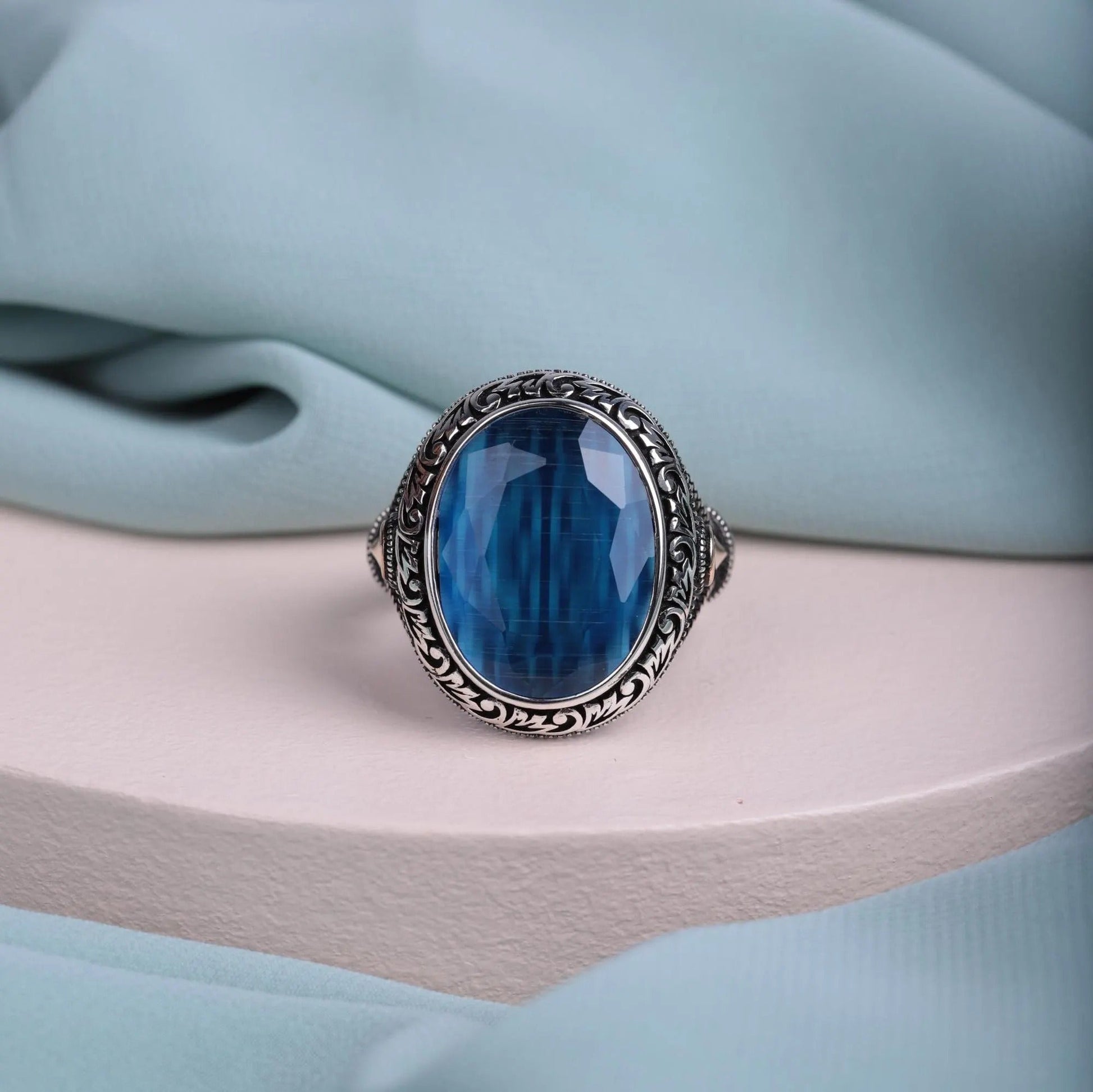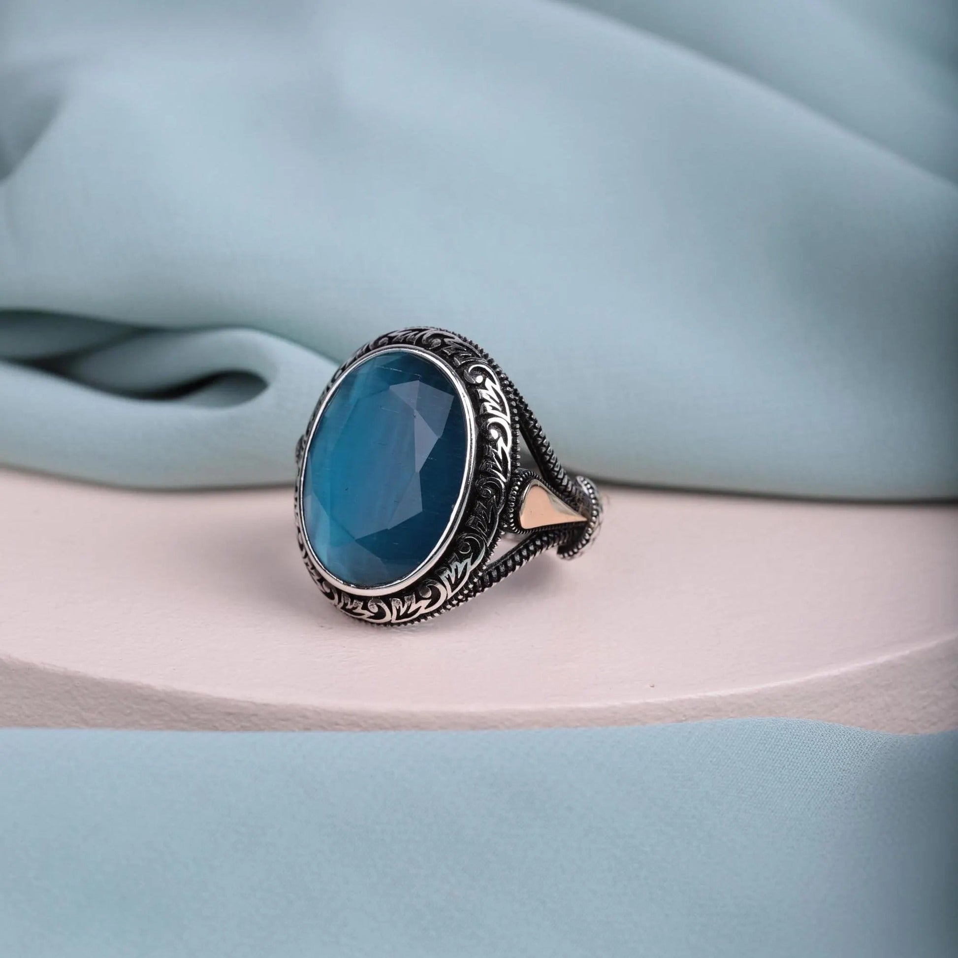The ring features intricate silver detailing with an elegant gold-colored drop accent on the side, adding a touch of luxury to its antique design.