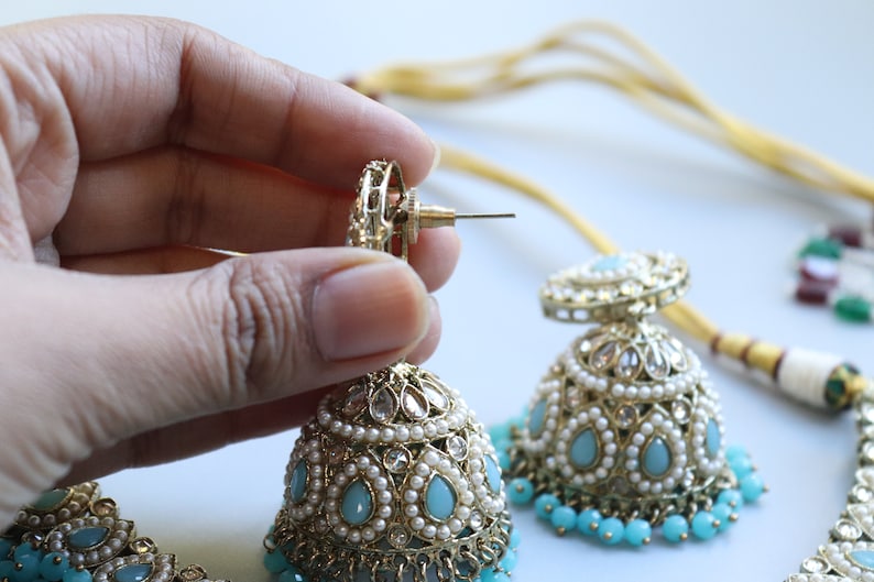 Simi Turquoise Aqua Polki Choker Necklace set