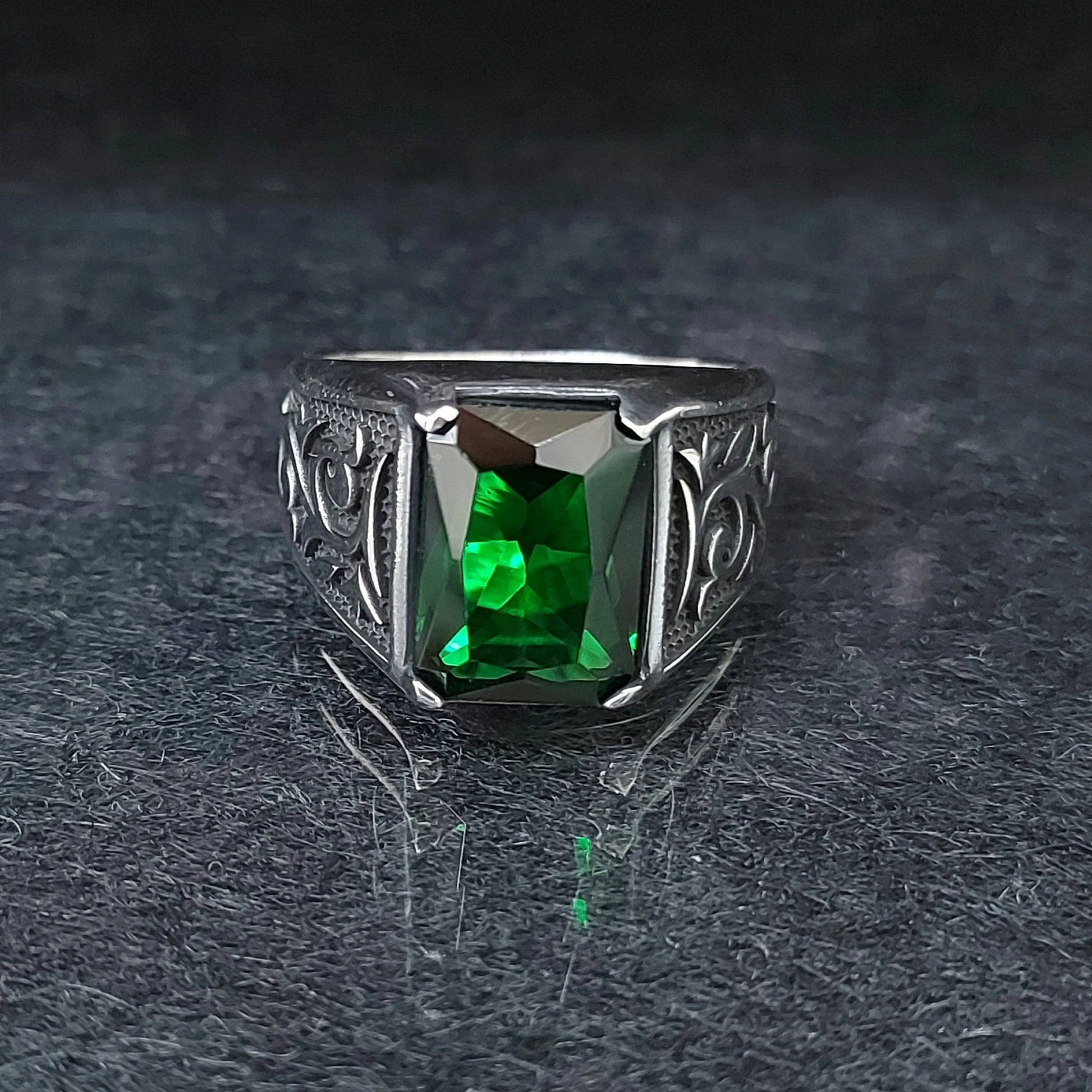 Silver Emerald Stone Ring , Square Zircon Green Stone Ring , Ottoman Style Ring , Vintage Style Ring , 925 Silver Turkish Handmade Mens Ring , Same Day Fast Shipping