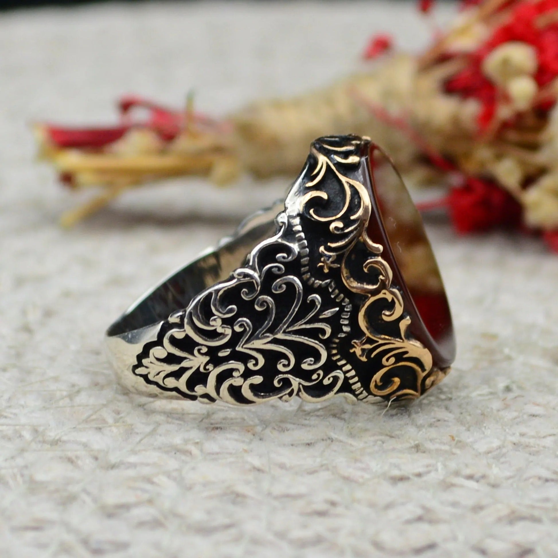 This Turkish handmade men's ring is a stunning piece crafted from 925 sterling silver, featuring a striking agate stone. The unique design and high-quality materials make this ring a timeless accessory for any man's wardrobe. Elevate your style with this exquisite piece that showcases the beauty of traditional Turkish craftsmanship. Perfect for adding a touch of elegance and sophistication to any outfit, this ring is sure to make a statement.