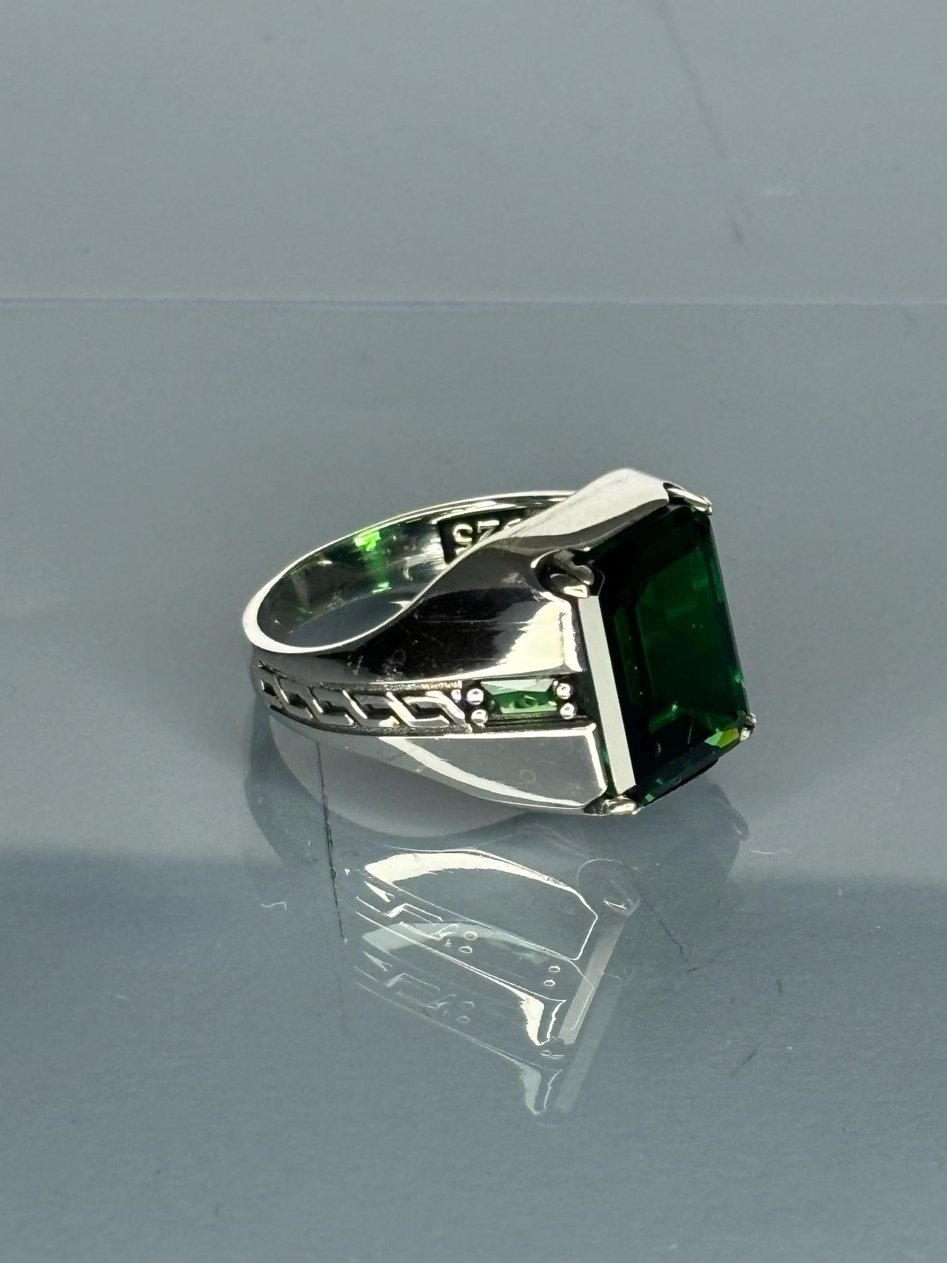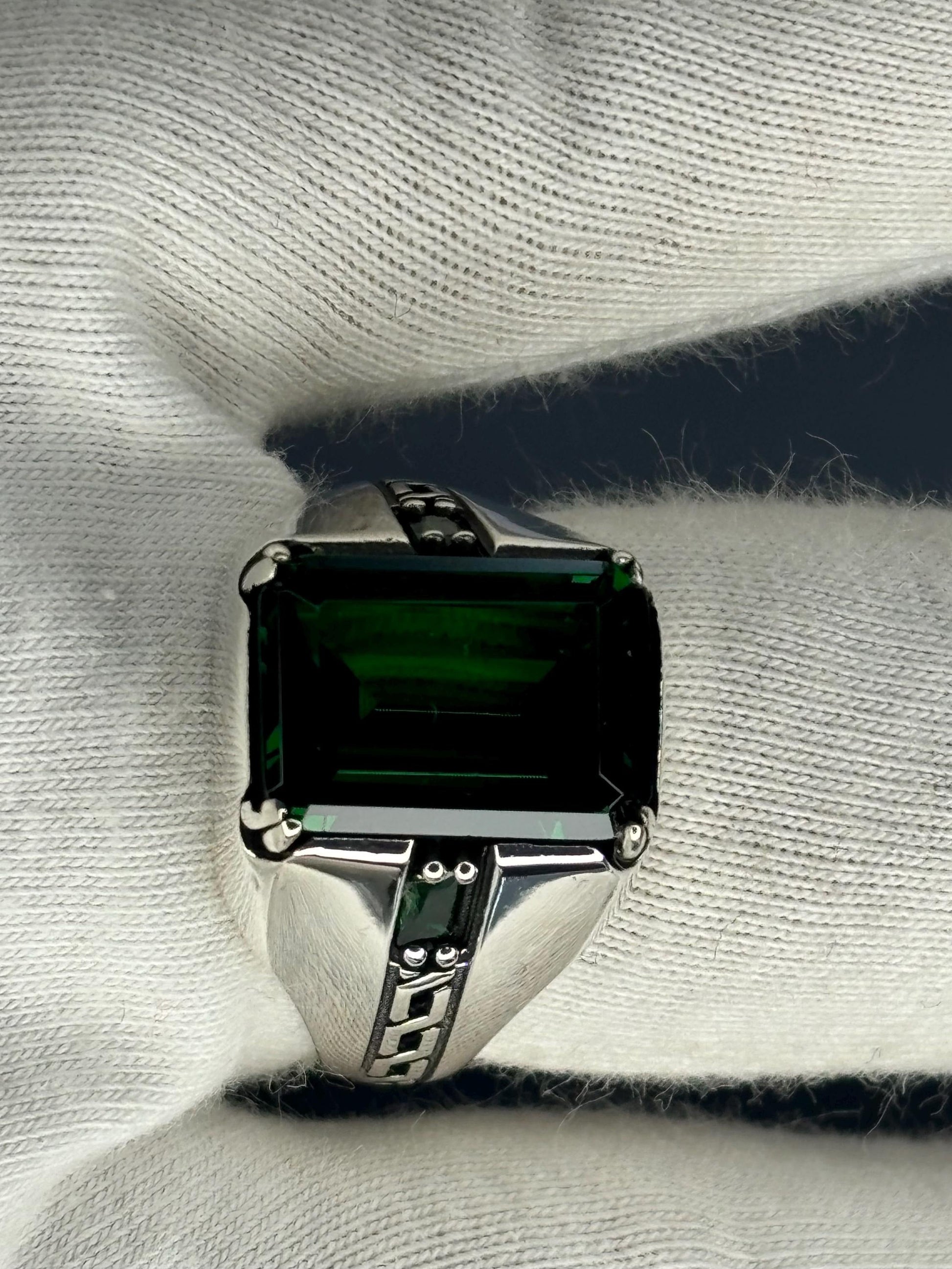 This striking 925 sterling silver men's ring with a bold emerald stone is a statement piece inspired by Ottoman design. Crafted with attention to detail, this ring features intricate sword and shield motifs, giving it a unique, historical look that’s perfect for vintage jewelry lovers. 🌟 Ideal for special occasions or as a daily accessory, this green gemstone ring adds elegance and personality to any outfit.