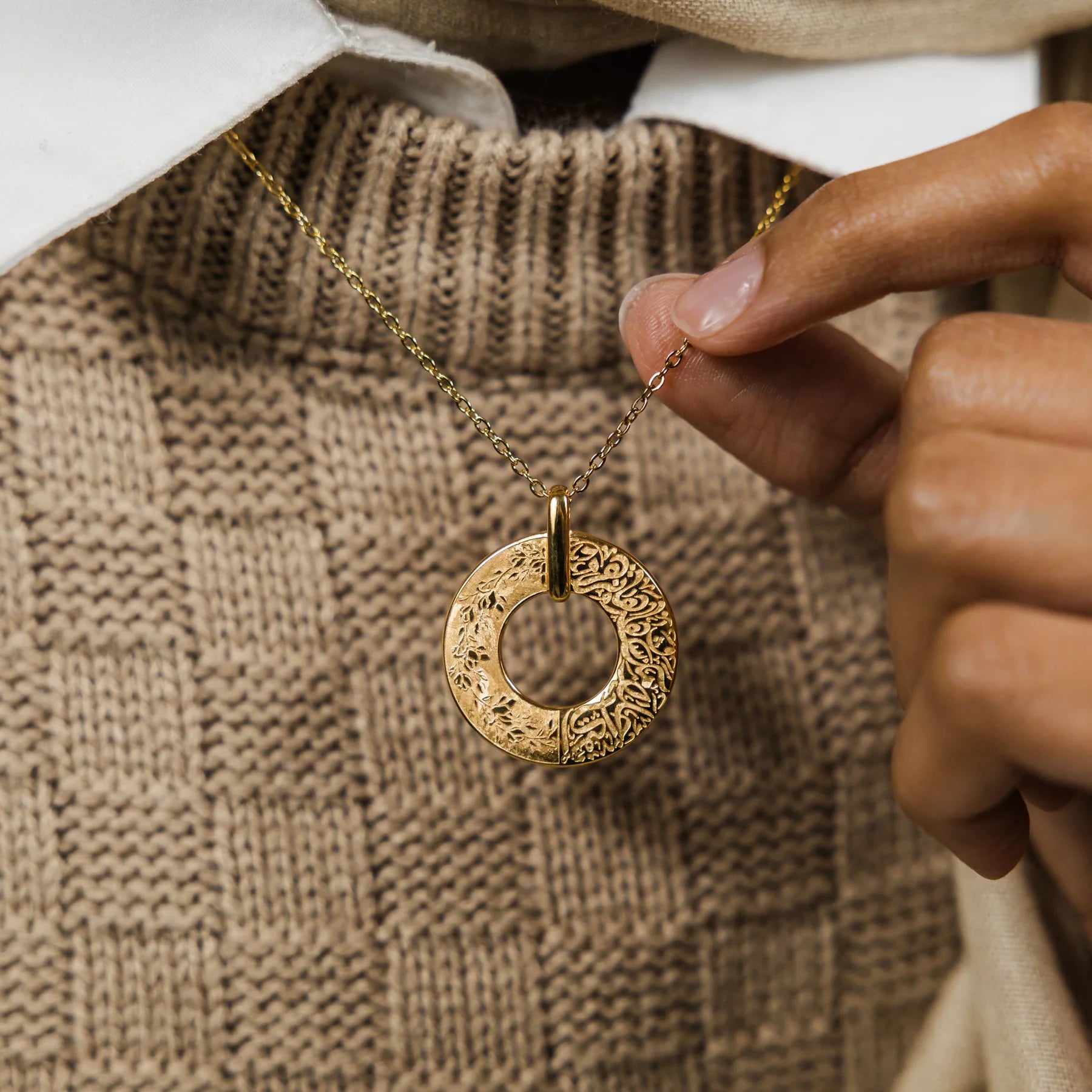 One of our most unique pieces to date. With the right side engraved with a poetic Arabic phrase, and the left side molded by olive leaves, this piece represents strength and prosperity. The perfect combination of modern calligraphy with a vintage aura, made just for you.